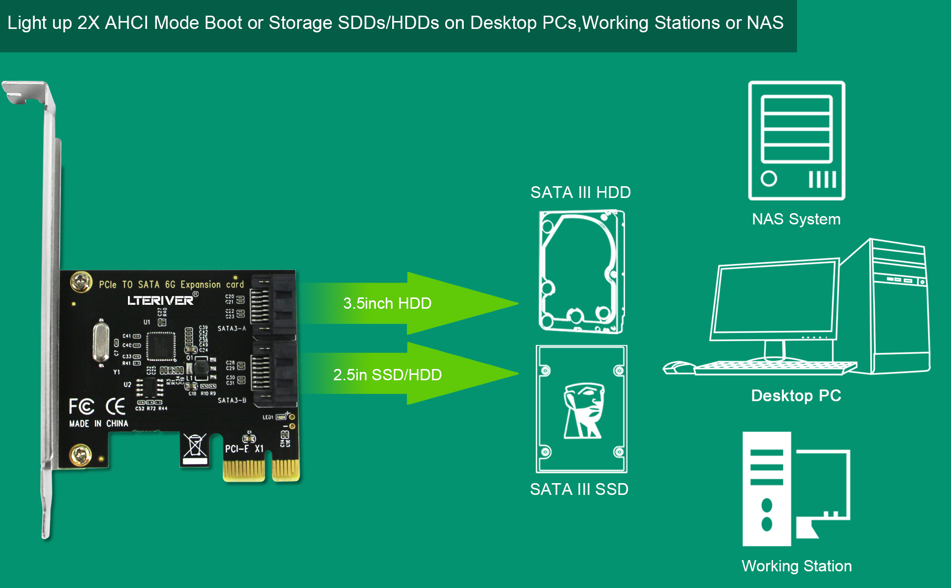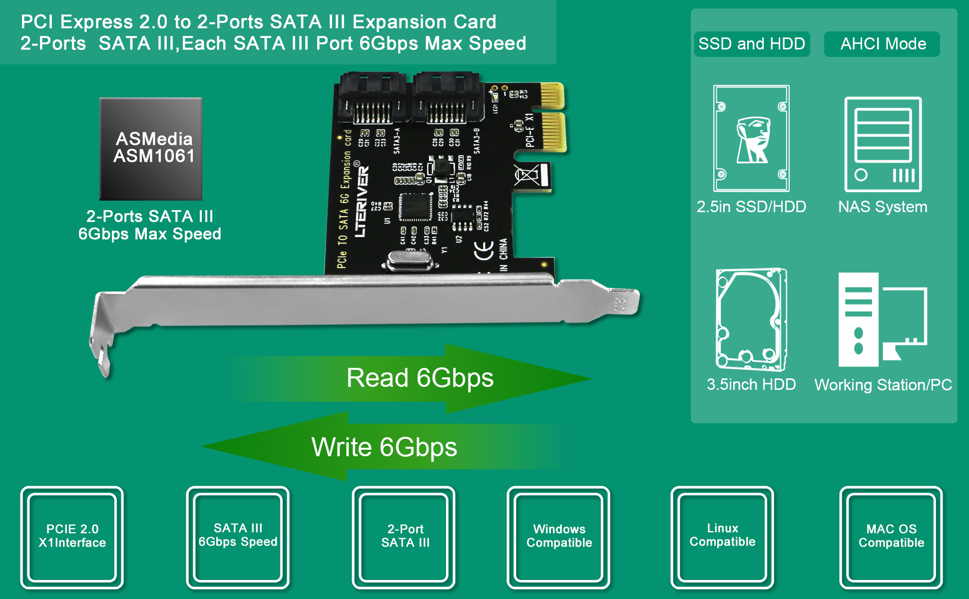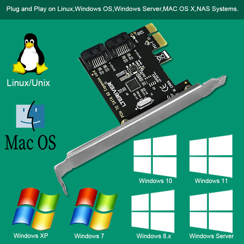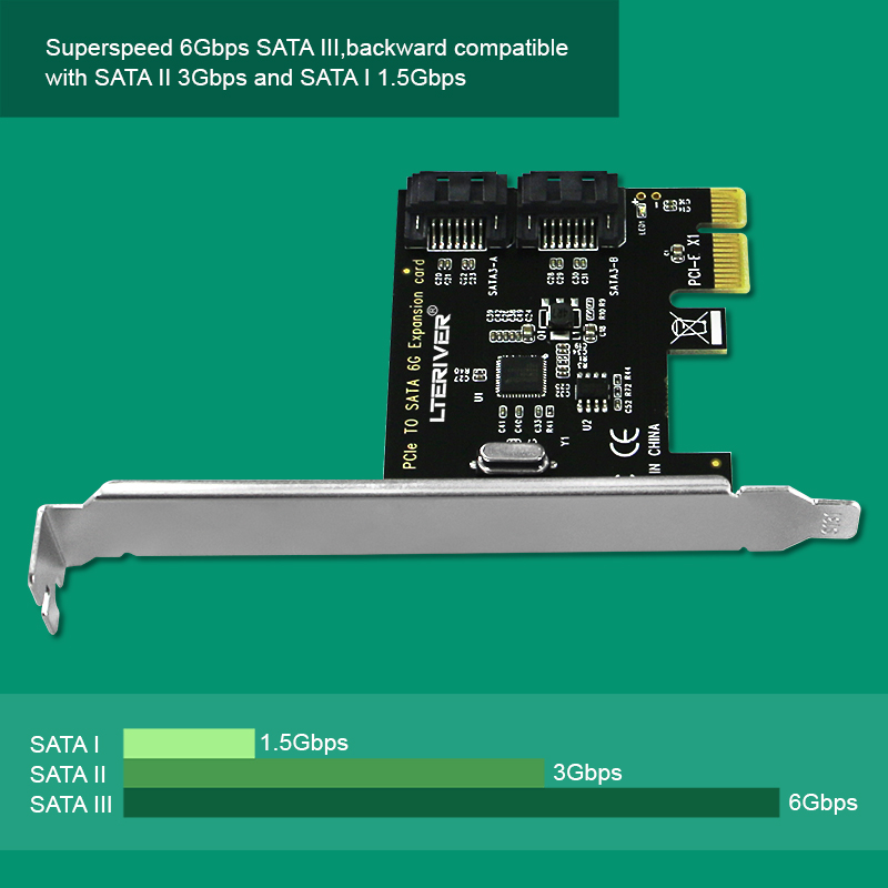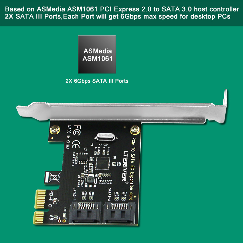LTERIVER PCE-G2S2 is a PCI Express Gen 2 to SATA III (Serial ATA) 6Gbps controller. It will covert PCIE X1 signal to 2-Ports SATA III on desktop PCs and Servers. Allow users add 2X max SATA HDD/SSD on their system for Boot Up or Storage. This PCIE SATA III card will support Plug and Play on Windows, Linux and MAC OS systems, now no need to install driver anymore for PCIE SATA expansion cards.