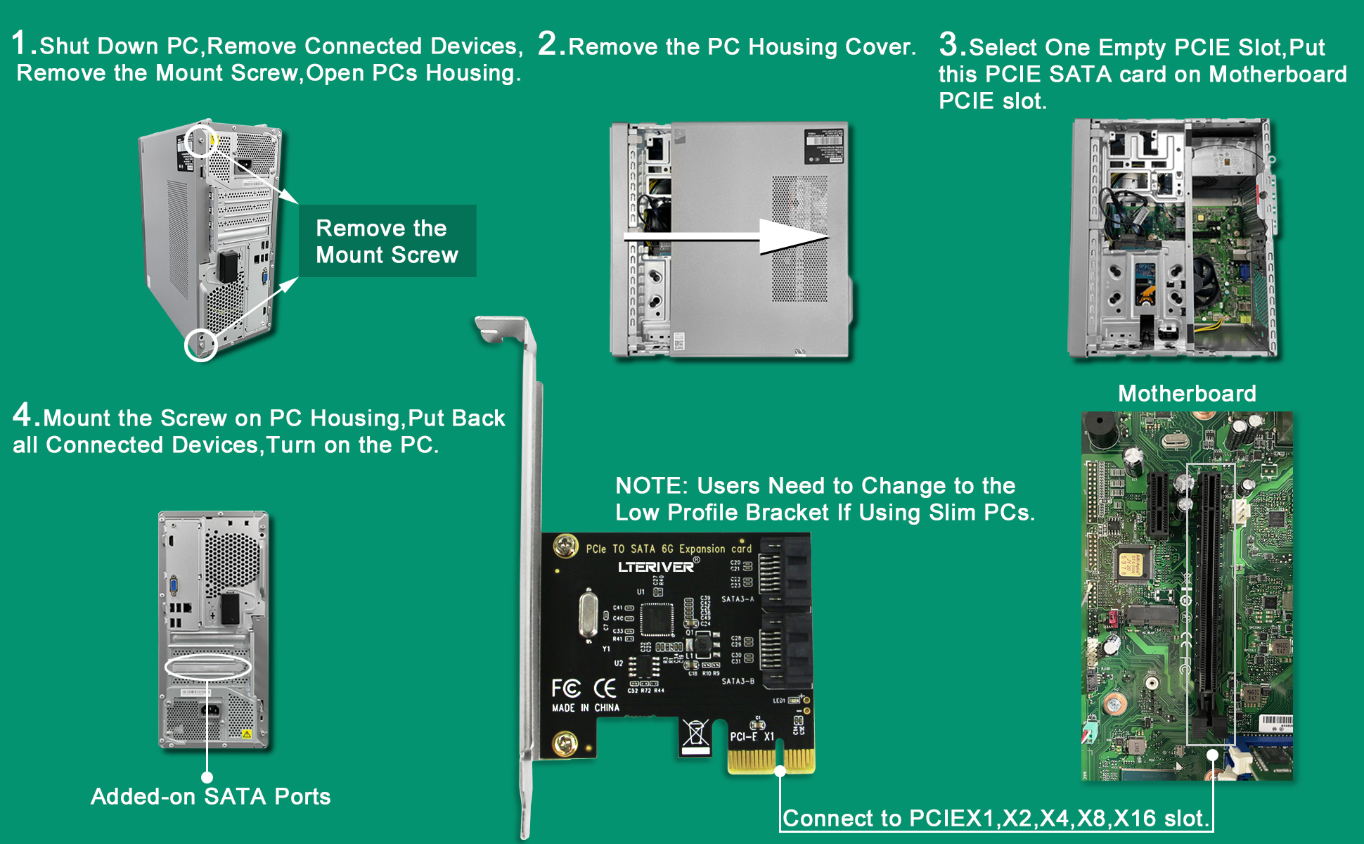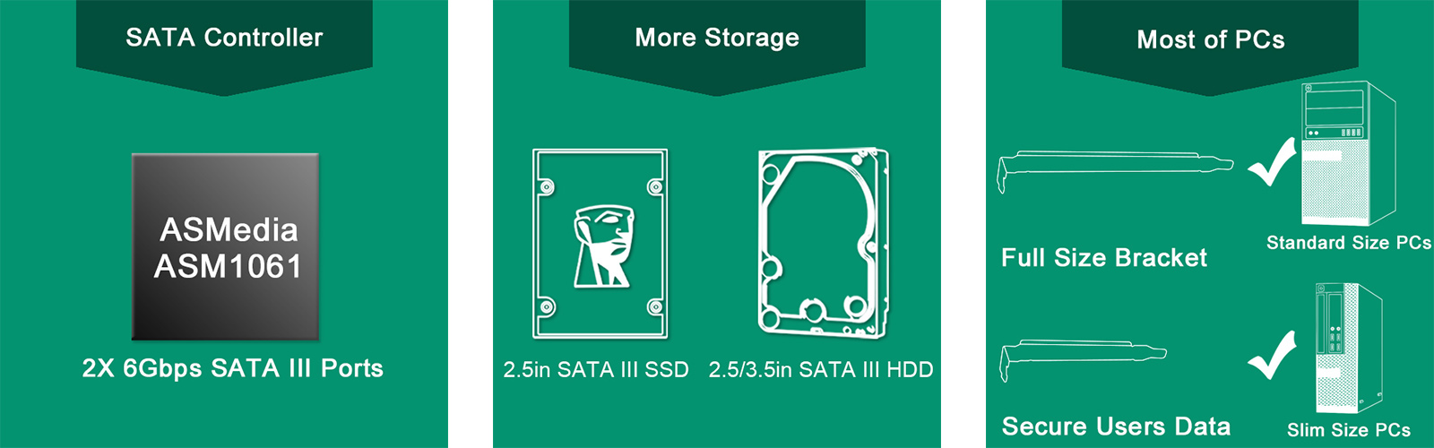 3. The Full Size Bracket Mounted on this PCIE SATA Card, will Work on Standard Size PCs. The Low Profile Bracket in the Package will Work on Slim Size PCs.